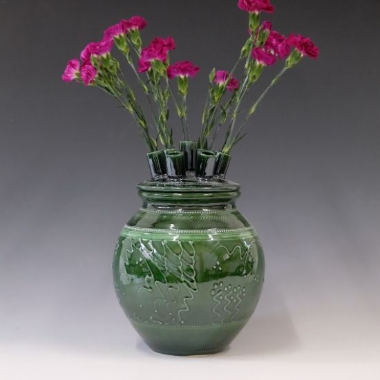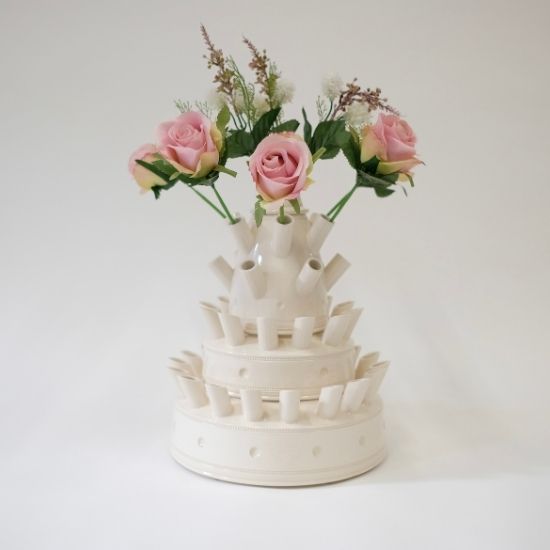 Recently, John has expanded his practice to include tulipieres, a vase form that originated in 18th-century Holland, adding another historical dimension to his work. Using white earthenware clay as his canvas, he decorates each piece with thick, trailed slip, a technique reminiscent of tube-lining, which adds texture and depth. The final touch is an oxide-stained transparent glaze that enhances the intricate slip work, highlighting the craftsmanship and rich surface details. Through this fusion of historical influence and technical mastery, John’s ceramics celebrate both tradition and innovation, bringing a timeless elegance to everyday objects