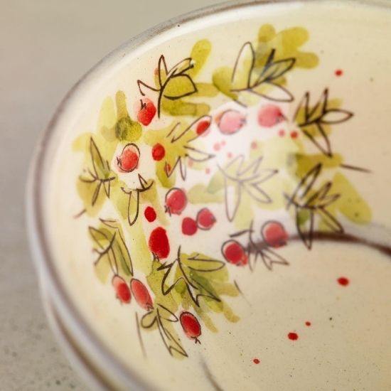 Drawing from Scottish woodlands, she captures the cheerful shapes and colours of flowers, berries, and foliage. Most of her pieces are wheel-thrown, with some, like her quirky toast racks, hand-built from slabs. Her red earthenware is dipped in cream slip, decorated with brushed and trailed slips, and finished with sgraffito detailing. Through her ceramics, Michelle celebrates the simple beauty of nature in everyday life.