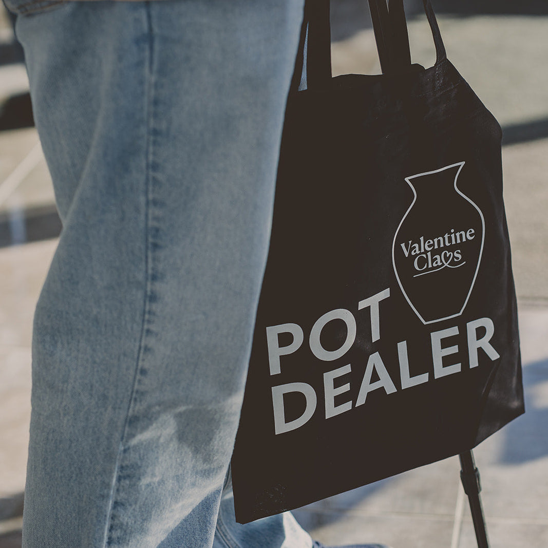 Crafted from 100% cotton in classic black, this bag flaunts the cheeky "Pot Dealer" slogan that'll get knowing smiles from fellow clay addicts.