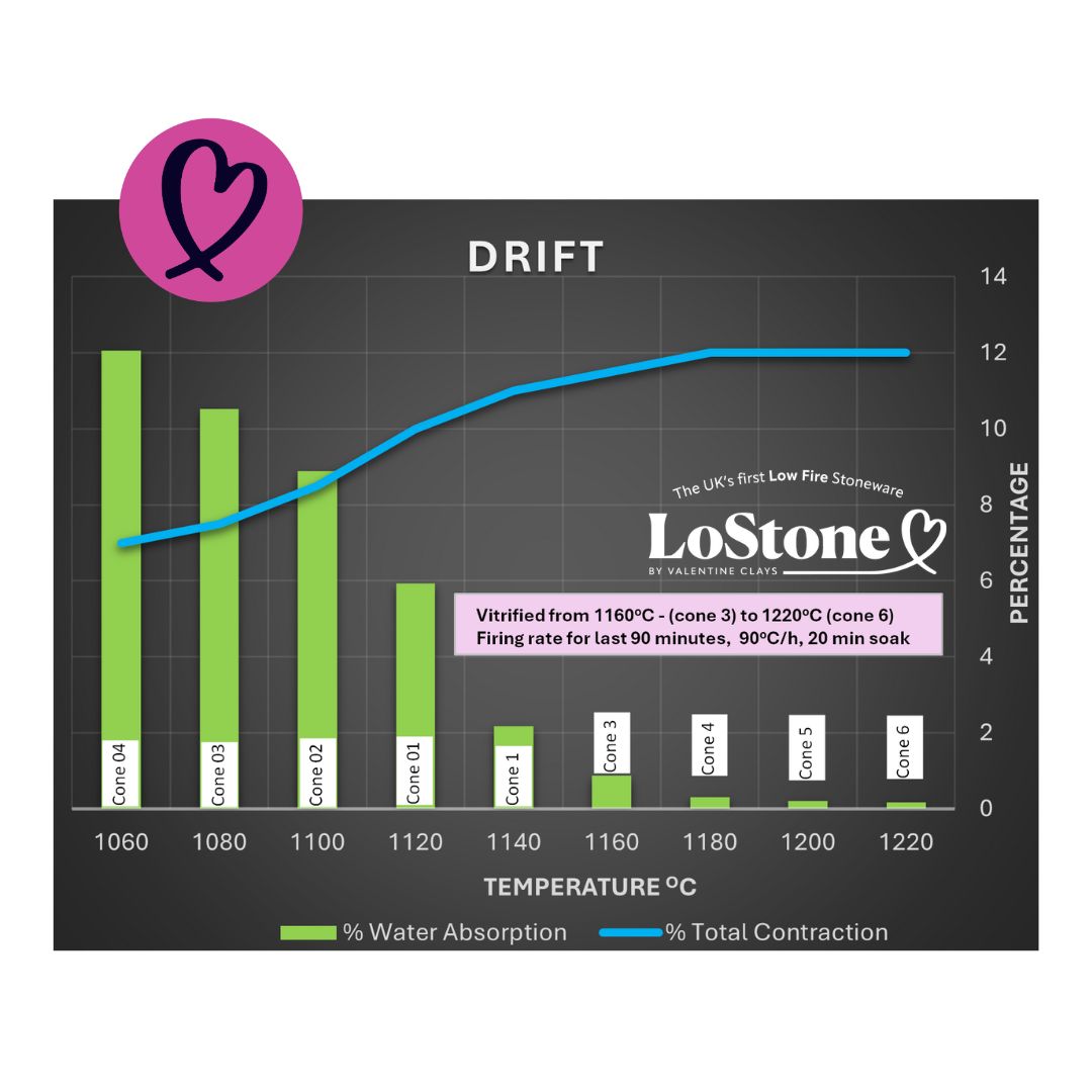 As part of our pioneering LoStone range, Drift is the UK’s first low-fire stoneware, achieving vitrification at 1160°c. Traditionally, stoneware has required high firing temperatures, but LoStone Drift redefines this standard, delivering the strength, durability, and refined appearance of high-fire stoneware at significantly lower temperatures.